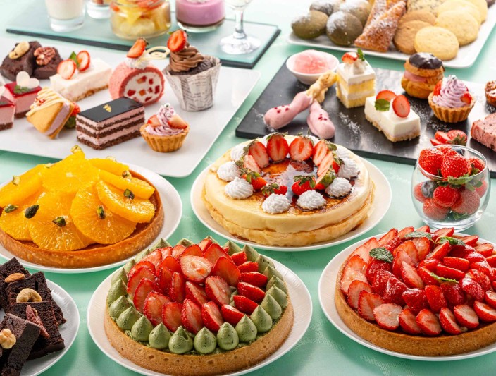 苺のタルトや苺のモンブラン、苺のパフェなど苺が主役のスイーツを31種、ピザやローストポーク、シーフードのエスカベッシュなどのライトミールを10種ご用意いたしました。